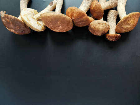 Forest mushrooms, autumn harvest, boletus, white and aspen. Raw fresh mushrooms on a dark background. Dry leaves, top view
