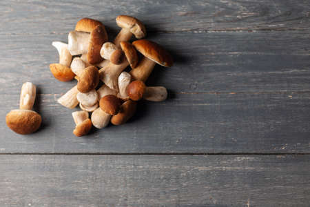 Boletus edulis mushroom on wooden background. Copy space. Top view. Organic forest food, edible fresh picked Porcini mushroom. Autumn harvest concept. Cep mushroom picking