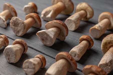 Boletus mushrooms with a brown cap are laid out in a row in size on a gray background