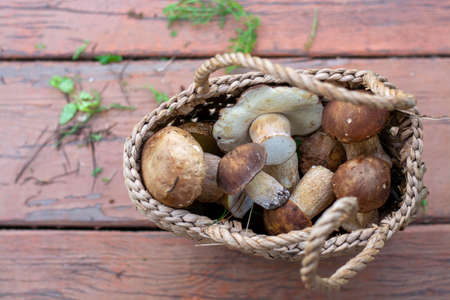 Forest picking mushrooms in wickered basket. Fresh raw mushrooms on the table. porcini or White mushroom