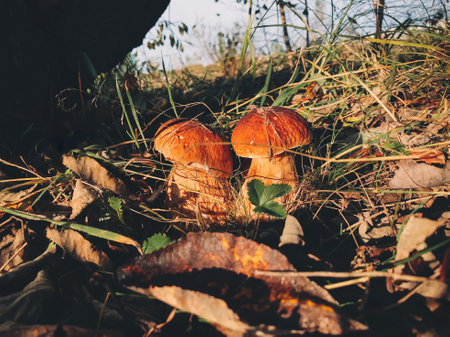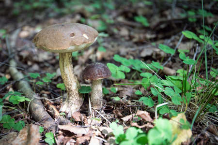 Two boletus edulis mushrooms grows. Orange cap mushrooms in forest