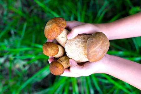 Top view on various raw mushrooms. Porcini mushrooms, birch mushroom, orange-cap boletus mushroom. The hands of a caucasian child hold a handful of mushroom on a background of green lawn. Focus on mushrooms in hands. Selective focus.
