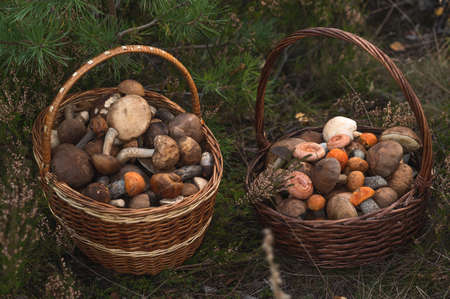 Two wicker baskets full of fresh autumn mushrooms. Natural light