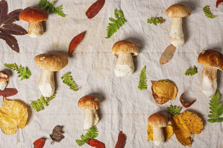 White mushrooms. Autumn pattern on fabric background. Cep or penny bun and dry leaves. Top view
