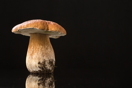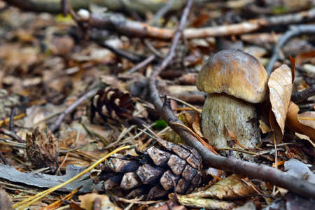 Small edible cep mushroom grows in wood. Cep mushrooms food. Boletus growing in wild nature