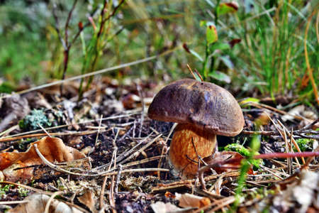 The brown boletus has just come out of the ground. A gnawed mushroom hat. Boletus on a blurred background of green leaves and pine needles.
