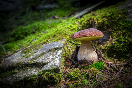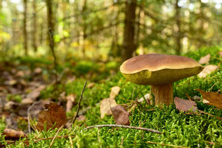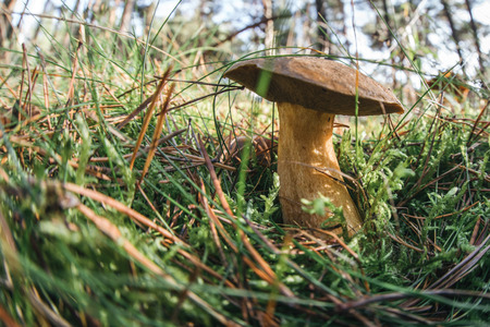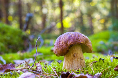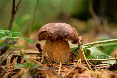 Small edible porcini mushroom grow in wood. Royal cep mushrooms food. Boletus growing in wild nature