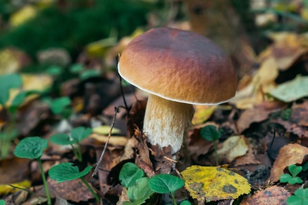 Edible cep mushroom grows under oak leaves. Royal cep mushrooms food. Boletus growing in wild nature