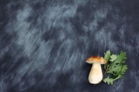 white mushroom boletus with oak leaves on a chalkboard a view from above / delicacy autumnal