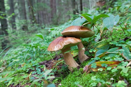Two edible mushrooms on forest glade. Royal cep mushrooms food. Boletus growing in wild nature