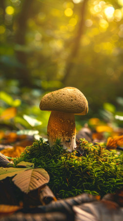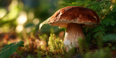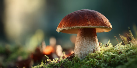 Porcini mushroom thriving in a natural forest environment, surrounded by green moss and plants, with soft sunlight illuminating the scene and providing a sense of natural growth