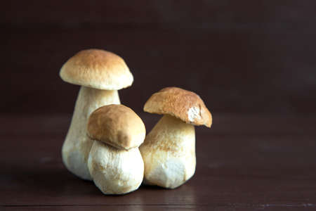 Three fresh ceps of different sizes stand on a brown wooden background. Three mushrooms.