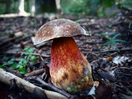 Mushroom Boletus edulis, edible mushroom boletus close up on the forest background. Mushrooming in the forest, mushroom hunting or picking.