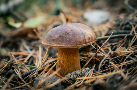 Macro photo of a brown Imleria badia mushroom growing on the forest floor among fallen pine needles in natural light.
