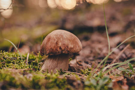 Beautiful edible mushroom boletus with brown cap in grass in autumn woodland. Boletus edulis. Porcini mushroom growing in fall woods. Tasty delicious fungi