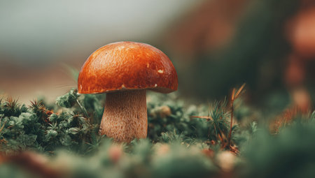 Porcini mushroom in forest moss. Beautiful autumn season nature. Edible mushrooms raw food. Vegetarian natural meal