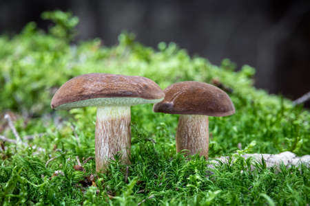 Two edible cep mushrooms in forest glade moss. Royal cep mushrooms food. Boletus growing in wild nature