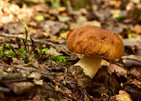 Edible mushroom in the autumn Sunny forest. White leg maroon hat