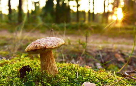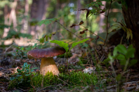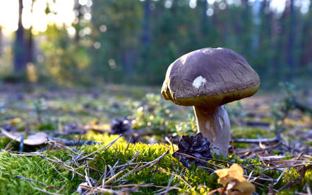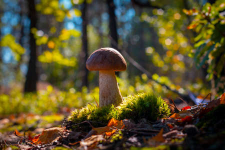 Beautiful white mushroom in the morning sun. Boletus edulis in the natural environment.