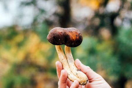 Hand holding big mushroom in autumn woods. Leccinum aurantiacumin with leaf in hand on background of sunny woods and fall leaves. Picking mushrooms in forest. Copy space
