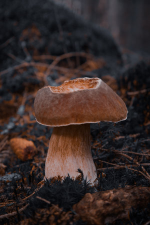 Close-up of a Single Porcini Mushroom on a Forest Floor. Concept of Nature, Fungi, Wilderness, Autumn. Vertical.