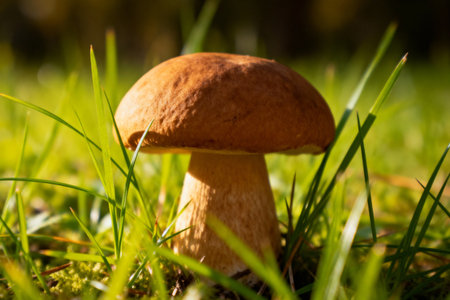 Beautiful boletus edulis on a green background in the forest closeup. Edible tasty mushroom penny bun, porcini, cep, porcino, king boletus macro. Mushroom with brown hat in the forest.