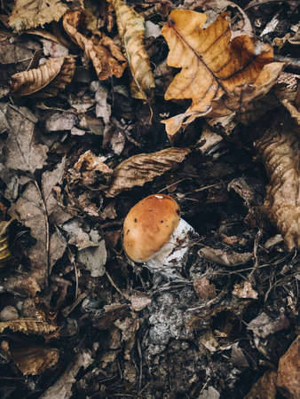 Mushroom growing in an autumn forest surrounded by fallen leaves. Concept of nature, fungi, autumn season, woodland, porcini mushroom. Copy space.