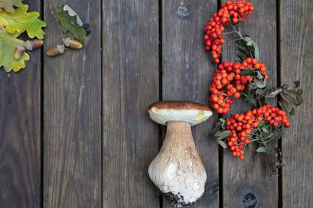Porcini mushrooms, red rowan, oak leaves, on a wooden background. there is room for text. Autumn concept, harvesting, forest gifts. High quality photo
