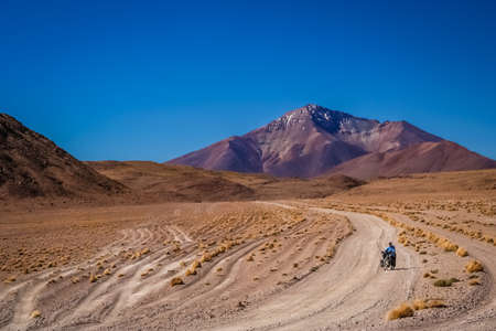 Off-road track in the Atacama desert, Bolivia with majestic colored mountains and blue sky in Eduardo Avaroa Andean Fauna National Reserve, Bolivia