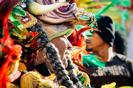 Concepcion De La Vega, DOMINICAN REPUBLIC - FEBRUARY 09, 2020: closeup portrait of man in pied masquerade mask on city street at dominican carnival on February 9 in Concepcion De La Vega