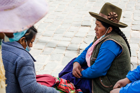 Copacabana, Bolivia-March 23, 2015:Bolivian women in traditional clothes on the street Copacabana.