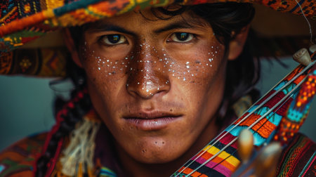 Confident Young Adult in Traditional Mexican Attire Against a Festive Background.