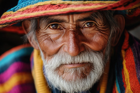 Close-up portrait of a smiling senior indigenous man wearing colorful traditional clothes and hat