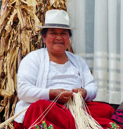 Cuenca, Ecuador - September 21, 2019: Indigenous woman weaving straw panama hat from natural plant fiber. Tradition and technic is UNESCO Intangible Cultural Heritage of Humanity. Ecuador