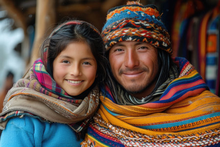 Bolivian women dressed in colorful traditional hats and shawls engage with visitors in a market, showing their intricate handicrafts amidst a lively and vibrant setting. Generated AI. This is a fictional character not a real person
