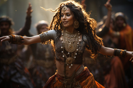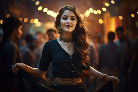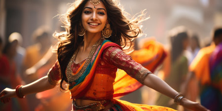 Energetic cool Indian woman in traditional saree dancing on the street. Generative AI.