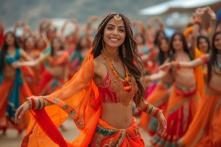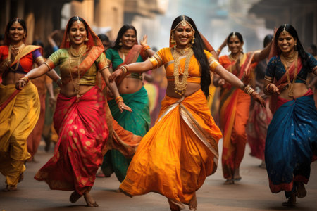 Group of Indian female dancers in traditional costumes joyfully performing a traditional dance at a vibrant festival, surrounded by colors.