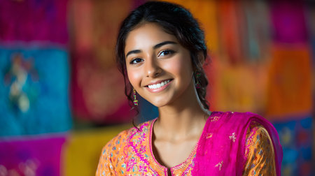 A young woman wearing a colorful sari with gold earrings and a smile on her face. Concept of happiness and positivity