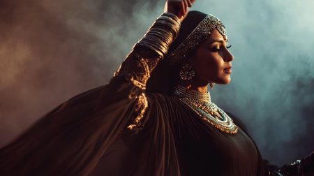 Elegant Woman in Traditional Attire with Dramatic Lighting and Jewelry.