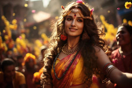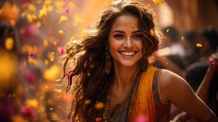 Smiling woman in traditional attire celebrating with colorful flower petals during a festive gathering with vibrant crowd background