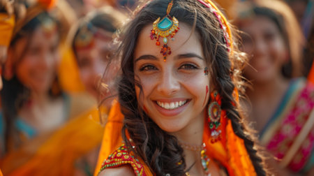 Smiling woman adorned in colorful Indian dress and jewelry, radiating joy and cultural elegance. A.I.