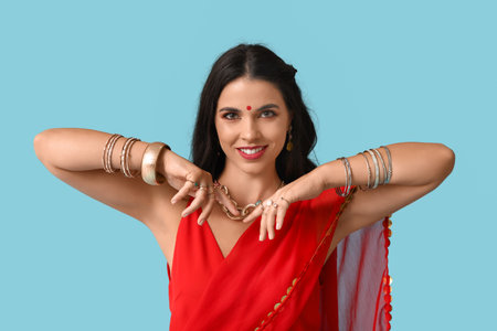 Beautiful young happy Indian woman in traditional sari dancing on blue background. Divaly celebration
