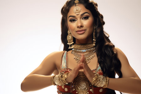 Beautiful native Indian young woman in traditional national clothes dancing ethnic indian dance on a white background. Close up