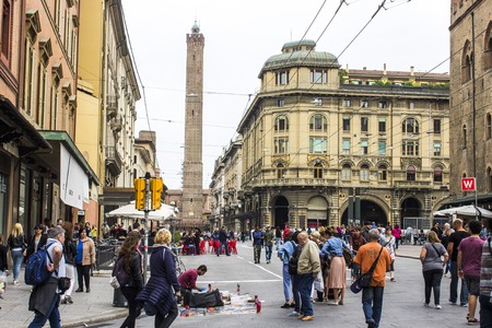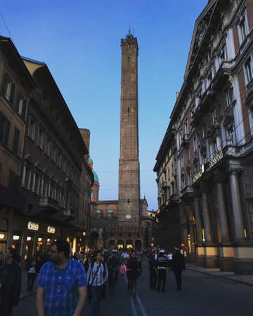 BOLOGNA, ITALY, MARCH 17, 2016: People are strolling on the via francesco rizzoli towards two towers of Bologna - Torre Garisenda and torre degli Asinelli