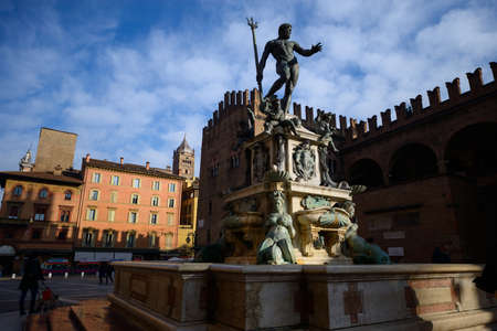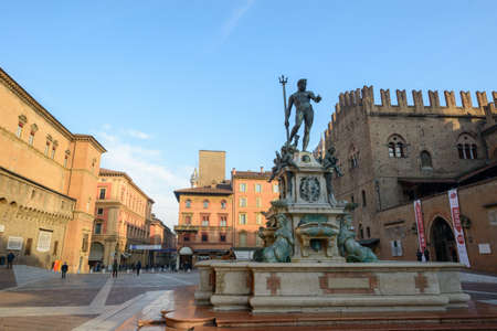Bologna, Italy: 04-15-2021: The beautiful Maggiore Square in Bologna illuminated at sunset
