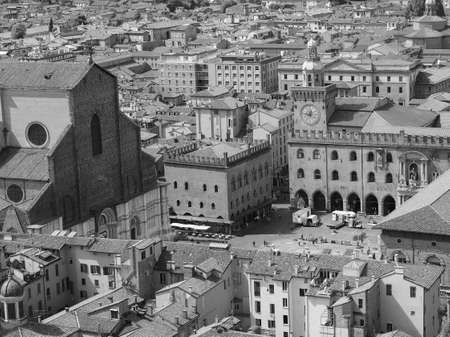 Aerial view of Piazza Maggiore square and San Petronio church in the city of Bologna, Italy in black and white
