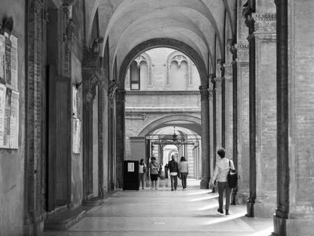 BOLOGNA, ITALY - CIRCA SEPTEMBER 2017: People in traditional colonnade porch (aka as portici) in black and white