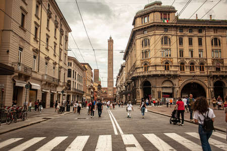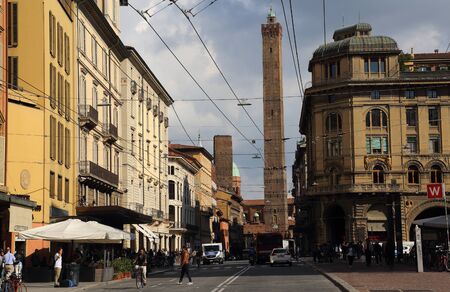 Bologna, Italy - September 25, 2017: Traffic of busses and cars and people walking along the Via Rizzoli street with the two medieval towers in Bologna, Italy on September 25, 201