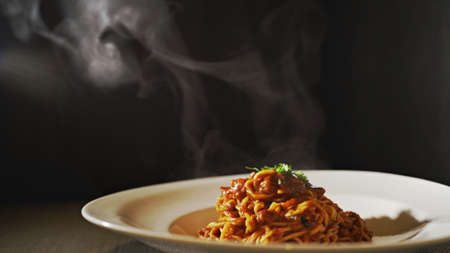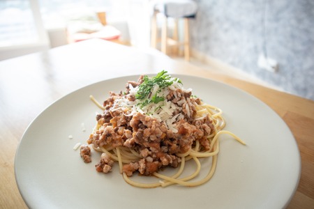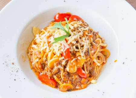 Minced beef bolognese with onions and carrots served with spaghetti, italian food