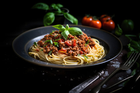 Pasta with bolognese sauce, fresh basil and tomatoes on a black plate on graphite, generative IA